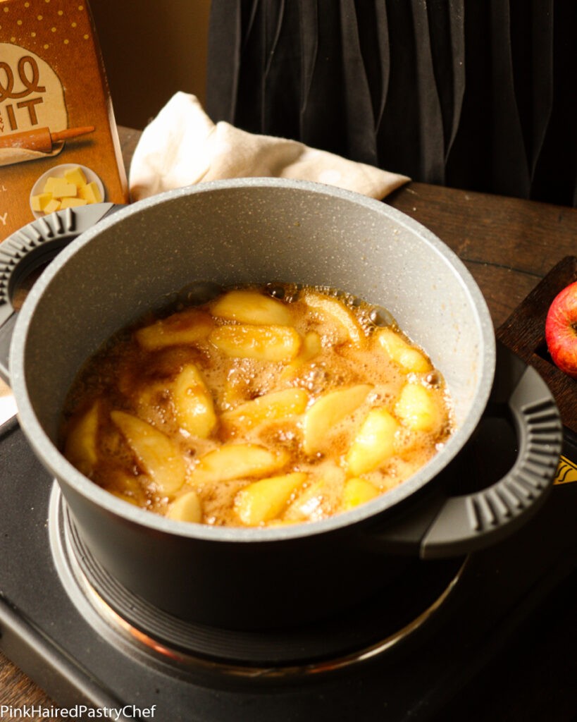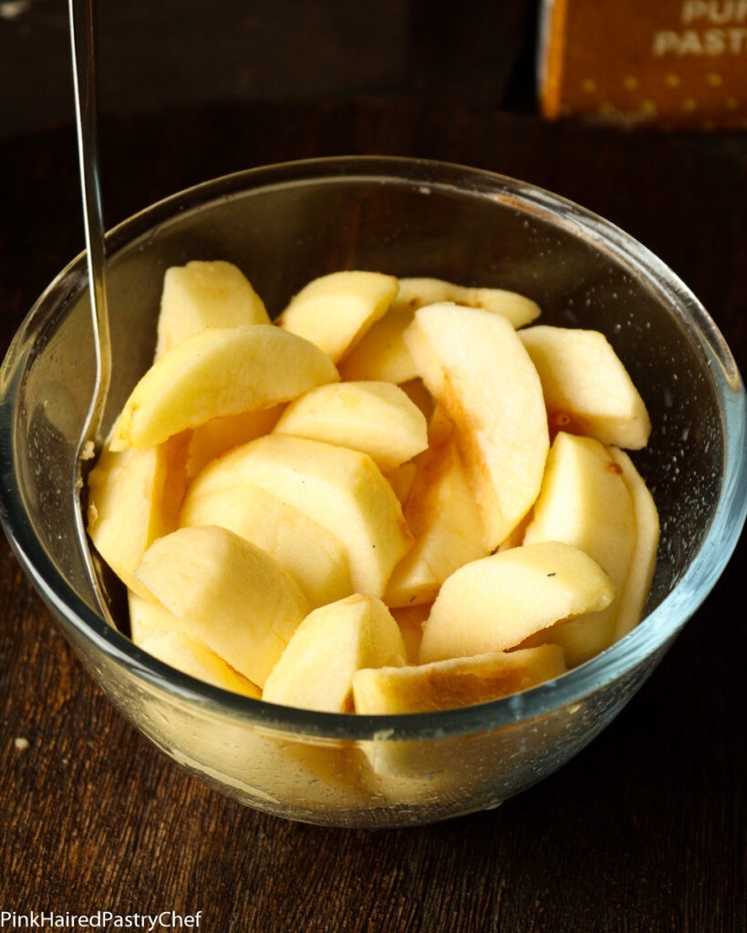 To begin, peel and core the apples and cut into chunky finger sized strips. Toss the apples in the lemon juice to prevent them browning and set to one side. In a small saucepan, add the sugar and water. Cook on a medium heat for 5-10 minutes until the sugar caramelises and turns an amber brown colour. Add the butter, vanilla and salt and whisk together. Cook for another minute until the colour darkens slightly to a dark amber. Add in the apples and mix briefly. Warm for 1-2 minutes until the sugar dissolves fully again and coats the apples. Leave to one side to cool slightly.