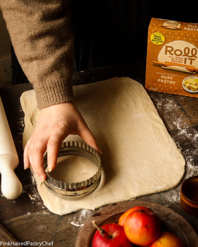 • Place the puff pastry discs on top of the apples, pressing gently into the edges to fully cover the apples.