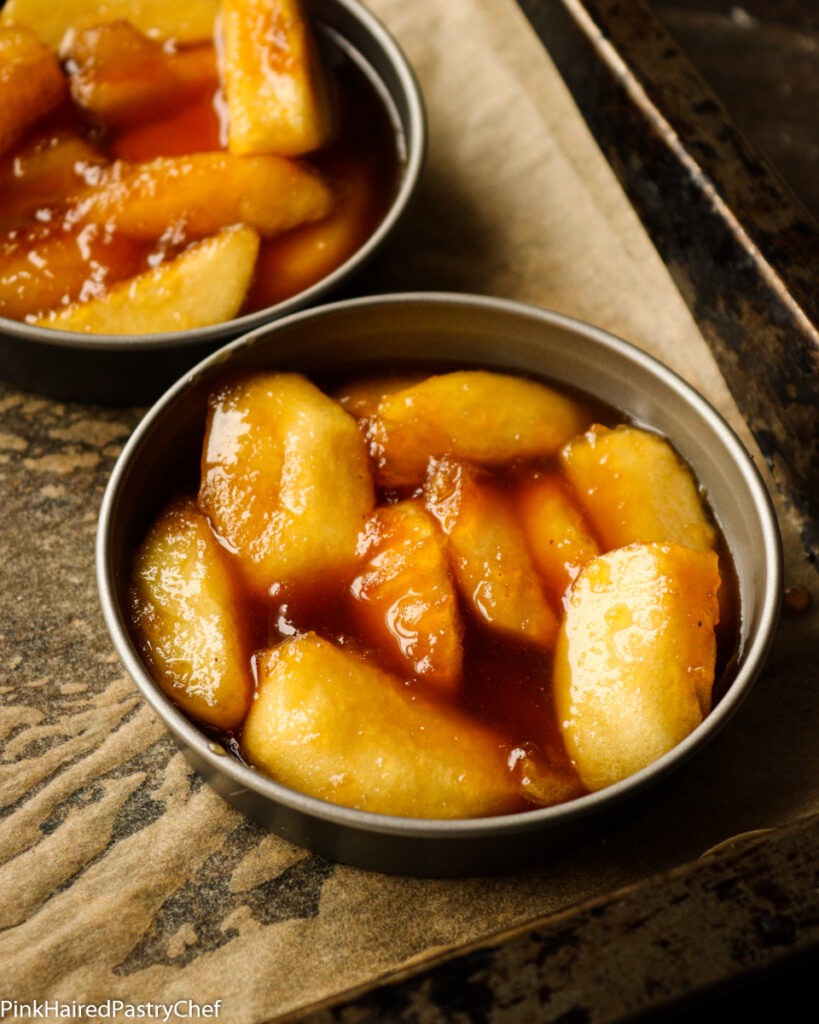 • Divide the apples between the tins, pouring some of the caramel on top of the apples.
