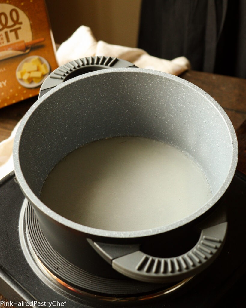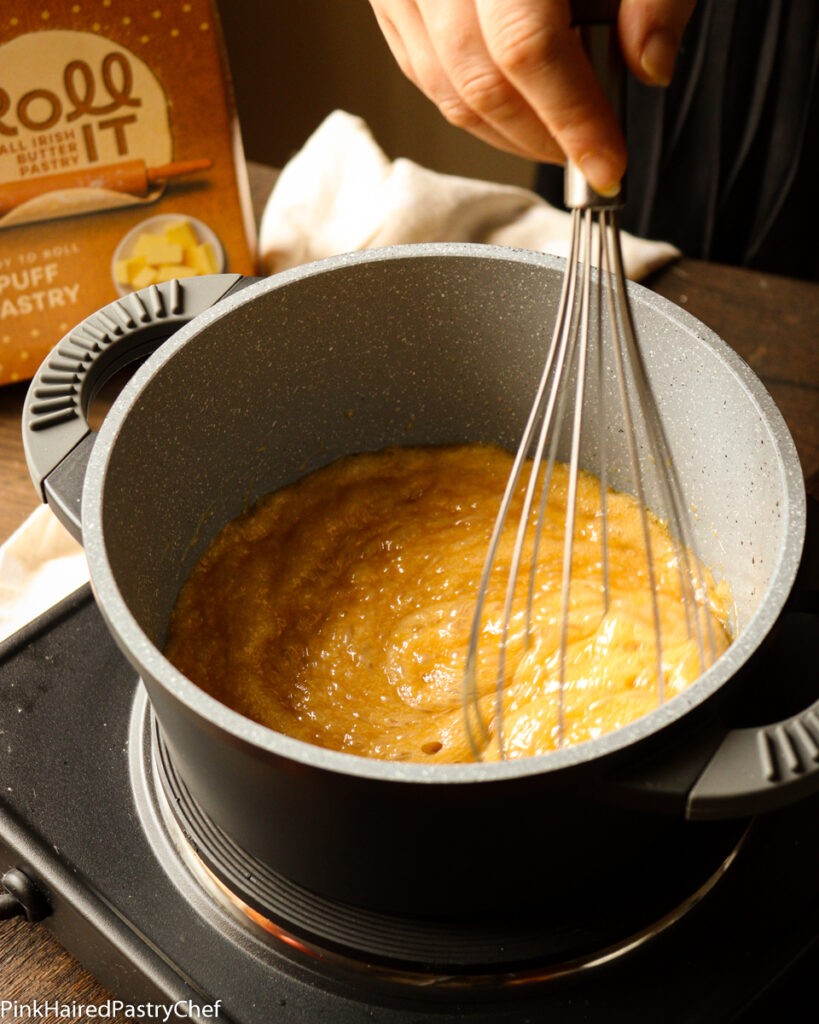 • Add the butter, vanilla and salt and whisk together. Cook for another minute until the colour darkens slightly to a dark amber.