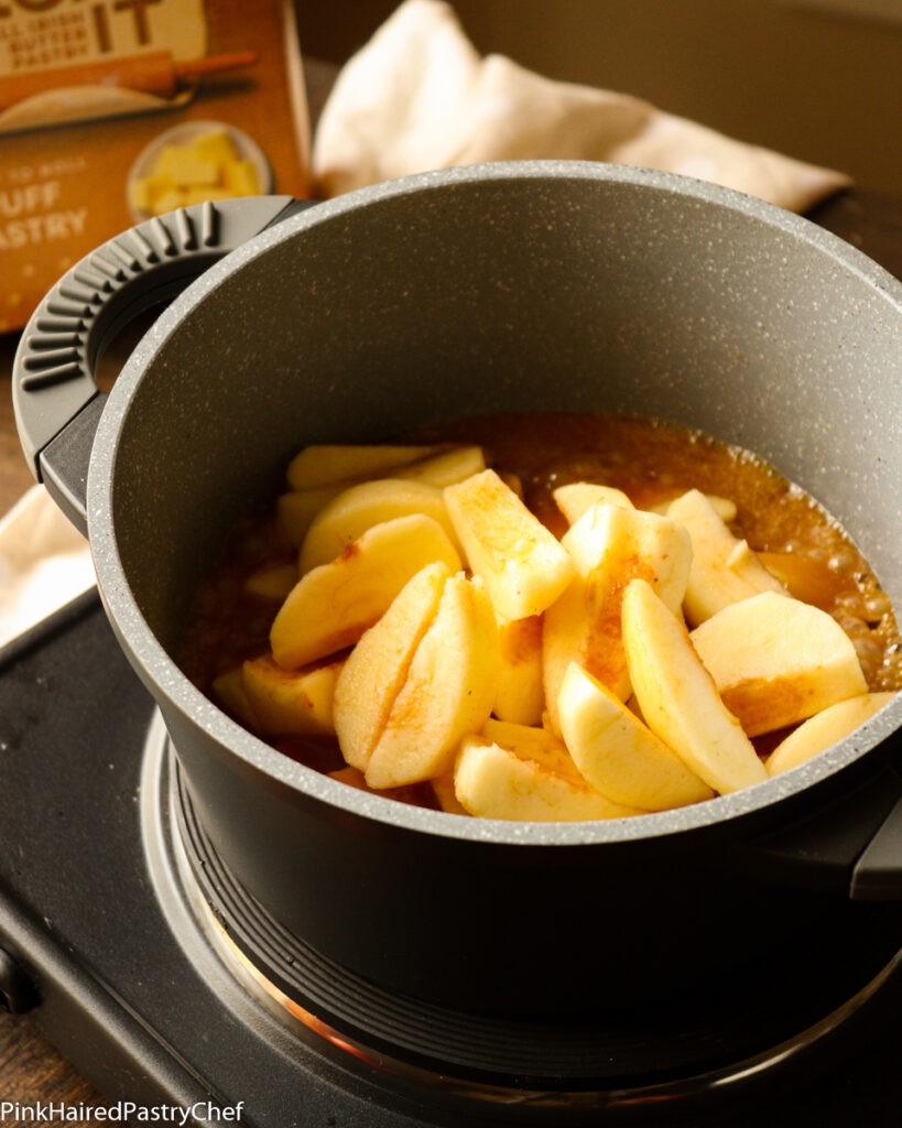 • Add in the apples and mix briefly. Warm for 1-2 minutes until the sugar dissolves fully again and coats the apples. Leave to one side to cool slightly.